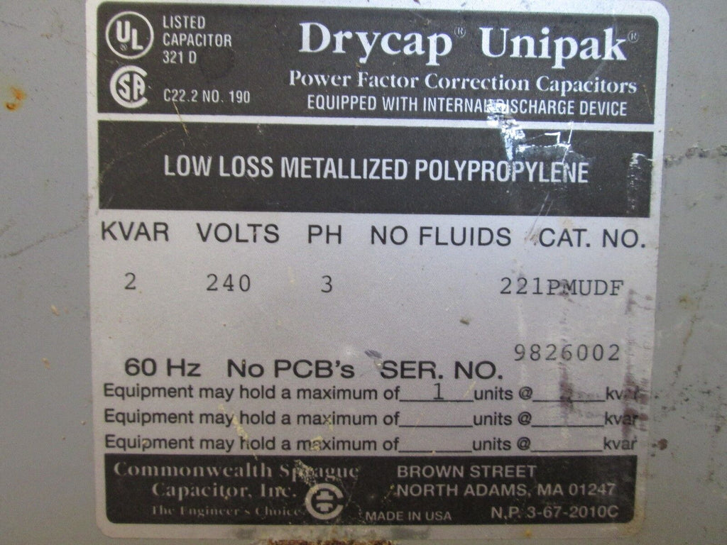 Drycap Unipak Power Factor Correction Capacitor 221PMUDF 2 KVAR 240V 3Ph 60Hz
