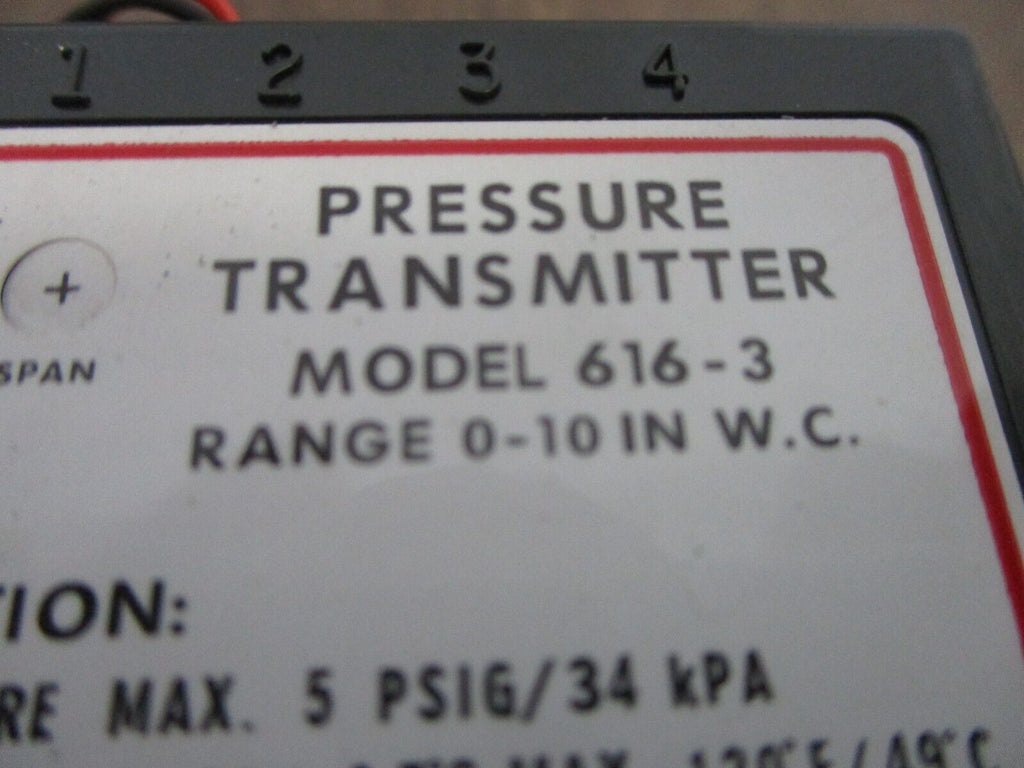 Dwyer Pressure Transmitter 616-3 Range: 0-10" W.C. Used Condition: UsedMPN: 616-3Brand: Dwyer Dwyer Pressure Transmitter 616-3 Range: 0-10" W.C. Used Dwyer Pressure Transmitter Part #: 616-3 Range: 0-10" W.C. Used Loc: 16H5-26 Dwyer Pressure Transmitter Part #: 616-3 Range: 0-10" W.C. Uséd Loc: 16H5-26