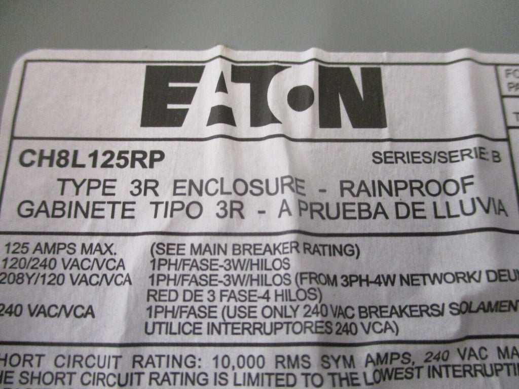 Eaton 3R Load Center CH8L125RP Ser. B 125 A 120/240V 8-Space Used._x000D_ Condition: UsedBrand: EatonMaximum Amperage: 125 AVoltage: 120/240 VMPN: CH8L125RP Eaton 3R Load Center CH8L125RP Ser. B 125 A 120/240V 8-Space Used. Eaton 3R Load CenterPart #:CH8L125RPSer. B125 A120/240 V8-Space*No Dead Front*Used Loc: AB11-6517 / AB12L4 Eaton 3R Load Center Part #:CH8L125RP Ser. B 125 A 120/240 V 8-Space *No Dead Front* Uséd Loc: AB11-6517 / AB12L4