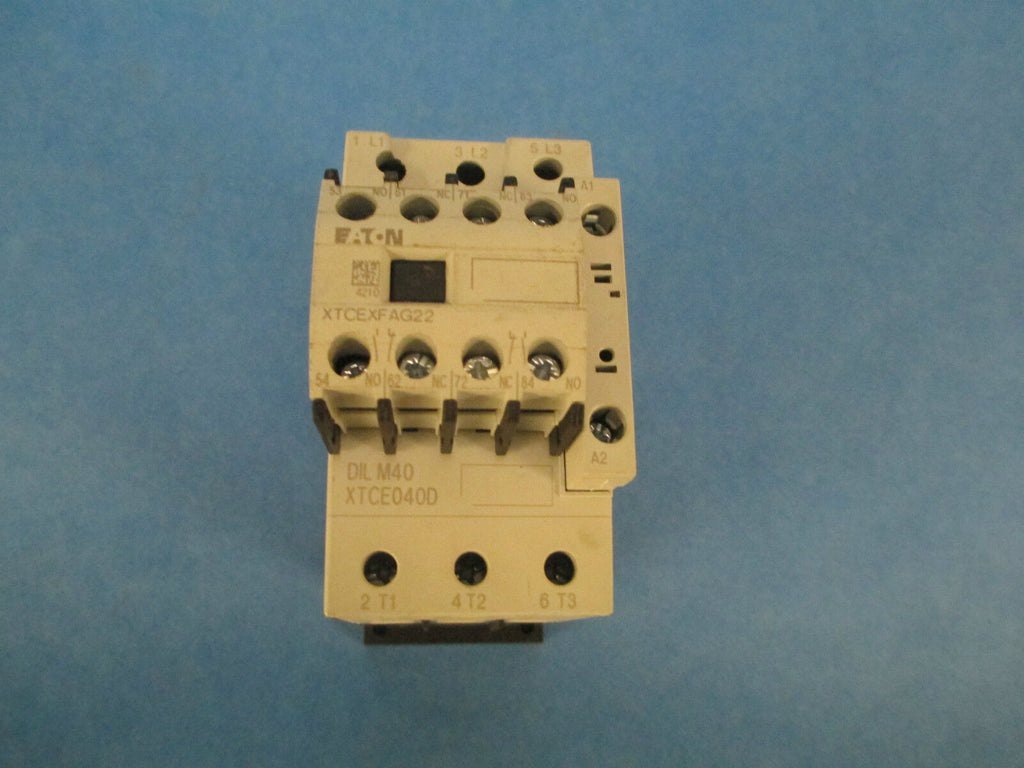 Eaton Contact XTCE040D, 40A 600V, With XTCEXFFAG22 Condition: UsedBrand: Cutler-HammerMPN: XTCE040DCountry of Manufacture: Romania Eaton Contact XTCE040D, 40A 600V, With XTCEXFFAG22 Eaton Contact Part # XTCE040D 50A 120V Relay XTCEXFFAG22 Used Loc 2D4-7 Eaton Contact Part # XTCE040D 50A 120V Relay XTCEXFFAG22 Uséd Loc 2D4-7