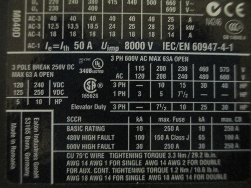 Eaton Contact XTCE040D, 40A 600V, With XTCEXFFAG22 Condition: ...