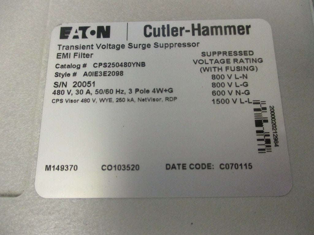 Eaton/Cutler-Hammer Surge Suppressor/EMI Filter CPS250480YNB 480V 30A 50/60Hz 3P Eaton/Cutler-Hammer Surge Suppressor/EMI Filter Part #: CPS250480YNB 480V 30A 50/60Hz 3PRatings:800V L-N800V L-G600V N-G1500V L-LUsed**Broken Interface**LOC 23F3-11 Eaton/Cutler-Hammer Surge Suppressor/EMI Filter Part #: CPS250480YNB 480V 30A 50/60Hz 3PRatings:800V L-N800V L-G600V N-G1500V L-LUséd**Broken Interface**LOC 23F3-11