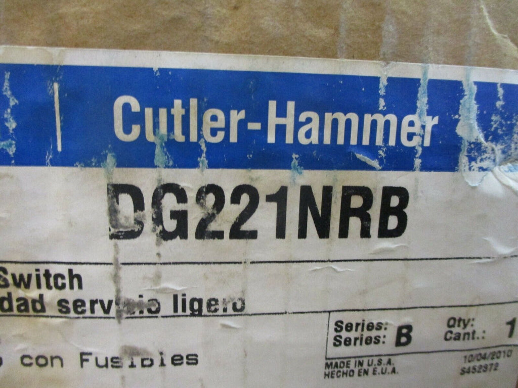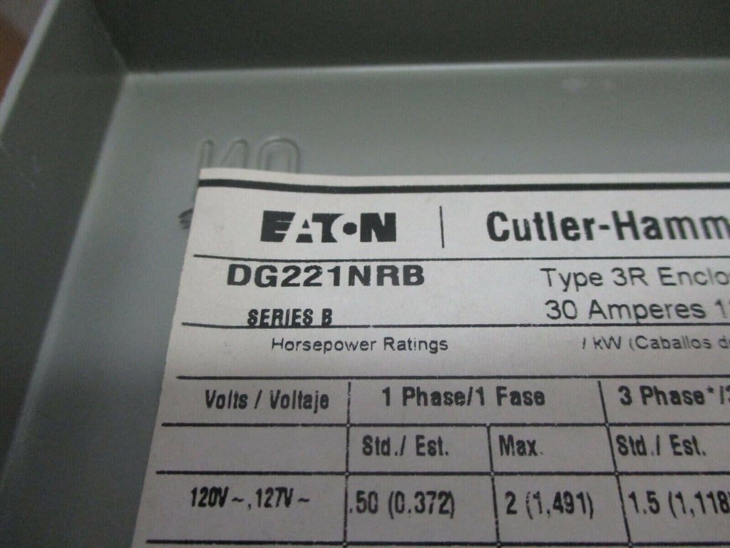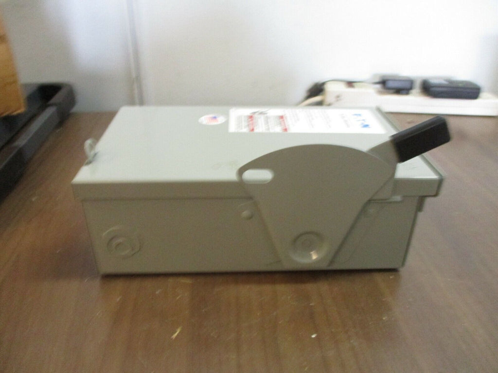 Eaton / Cutler-Hammer Type 3R Fusible Safety Switch / Disconnect DG221NRB 30A 3W_x000D_ Condition: New – Open boxCurrent Rating: 16-30 AMaximum Amperage: 30 AMPN: DG221NRBOperation Method: On/OffBrand: Eaton / Cutler-HammerVoltage: 201-250 V Eaton / Cutler-Hammer Type 3R Fusible Safety Switch / Disconnect DG221NRB 30A 3W Eaton / Cutler-Hammer Type 3R Fusible Safety Switch / Disconnect Part #: DG221NRB 30 A 240 V 3W New Surplus Loc: AB11-3721 / 18H1 Eaton / Cutler-Hammer Type 3R Fusible Safety Switch / Disconnect Part #: DG221NRB 30 A 240 V 3W New Surplus Loc: AB11-3721 / 18H1