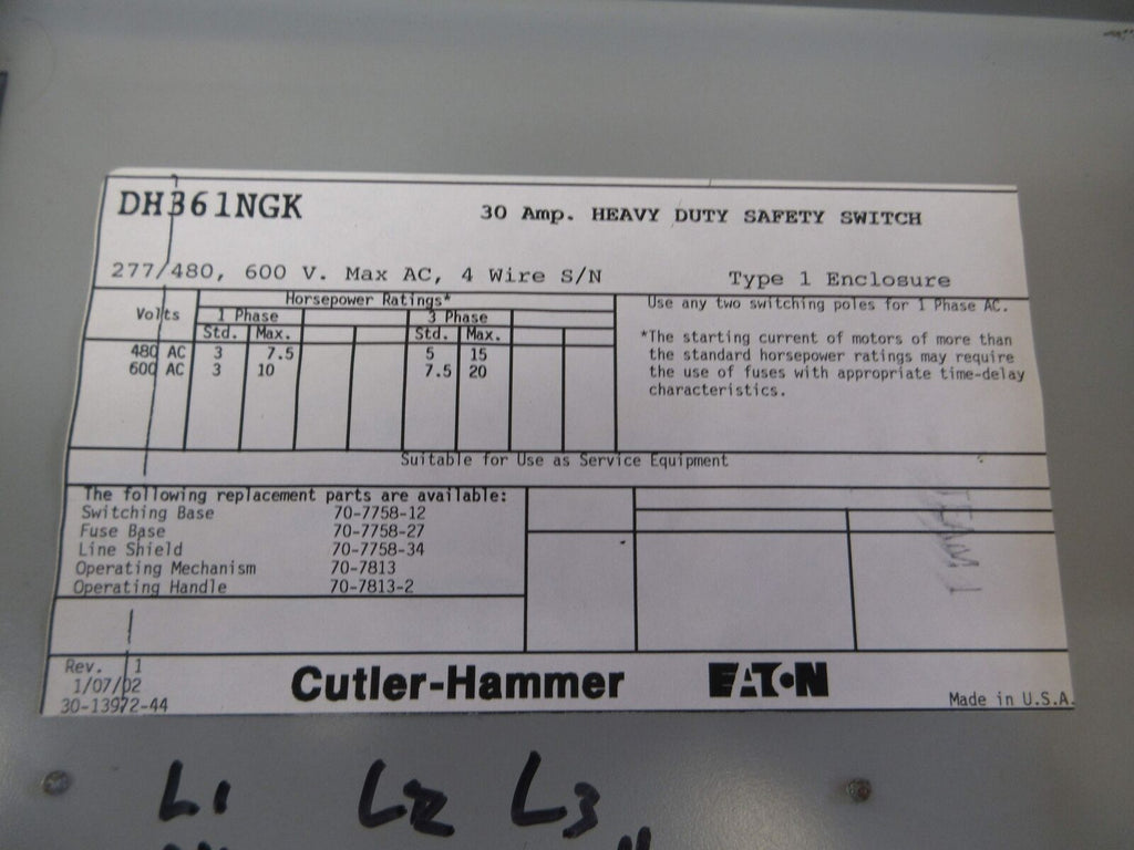Eaton Fusible Safety Switch / Disconnect DH361NGK 30A 600V 4W ...