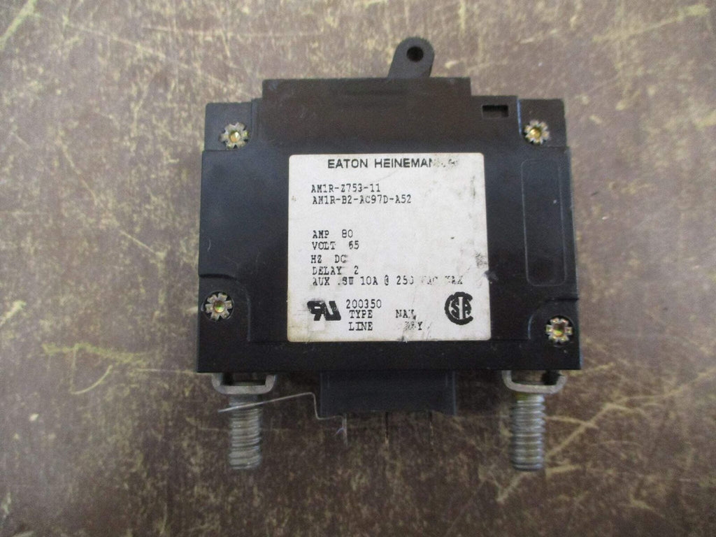 Eaton Heinemann DC Circuit Breaker AM1R-Z753-11 AM1R-B2-AC97D-A52 80A 65VDC 1P Eaton Heinemann DC Circuit Breaker Part #: AM1R-Z753-11 AM1R-B2-AC97D-A52 80 A 65 VDC 1P Used Loc: 59F3-28