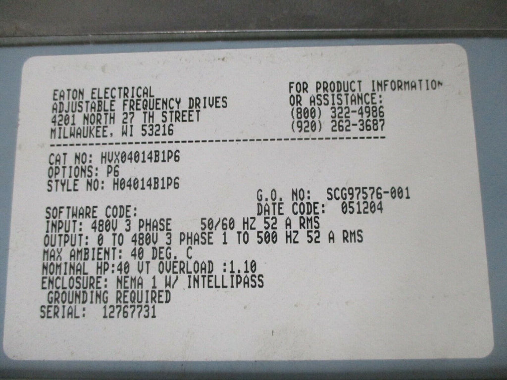 Eaton HVX9000 AC Drive w/ Intellipass Bypass HVX04014B1P6 40HP...