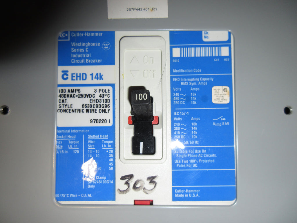Eaton Main Breaker Circuit Breaker Panel Part #: IC96646 100A Max 208Y/120 3Ph 4W 100A Main Main P/N: EHD3100 42-Slot Breakers: (42) 20A 1P *Missing (1) Cover Screw* Used Loc: AB20N1-25