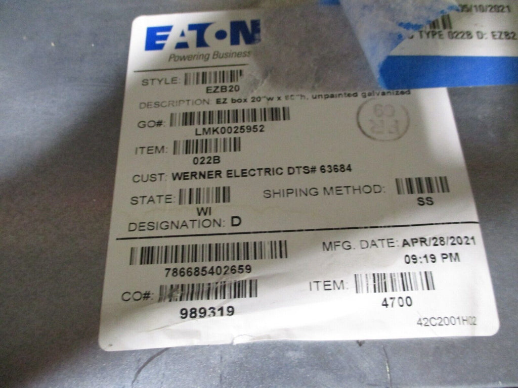 Eaton Main Lug Panelboard Interior w/ Box & Cover EZB2060R / EZV2060F 225A 3W Condition: New – Open boxBrand: EatonColor: GrayCurrent Rating: 201-250 AMPN: P21A225LB42AH01,EZV2060F,EZB2060RMaximum Amperage: 225 AType: Main Lug PanelVoltage: 208Y/120V Eaton Main Lug Panelboard Interior w/ Box & Cover EZB2060R / EZV2060F 225A 3W Eaton Main Lug Panelboard Interior w/ Box & Cover Part #: P21A225LB42AH01 / EZB2060R / EZV2060F 225 A 208Y/120V 3W 42-Slot Breakers: (27) 20A 1P *Damaged Box*New Surplus Loc: AB11-5364 / AB1M3 Eaton Main Lug Panelboard Interior w/ Box & Cover Part #: P21A225LB42AH01 / EZB2060R / EZV2060F 225 A 208Y/120V 3W 42-Slot Breakers: (27) 20A 1P *Damaged Box* New Surplus Loc: AB11-5364 / AB1M3