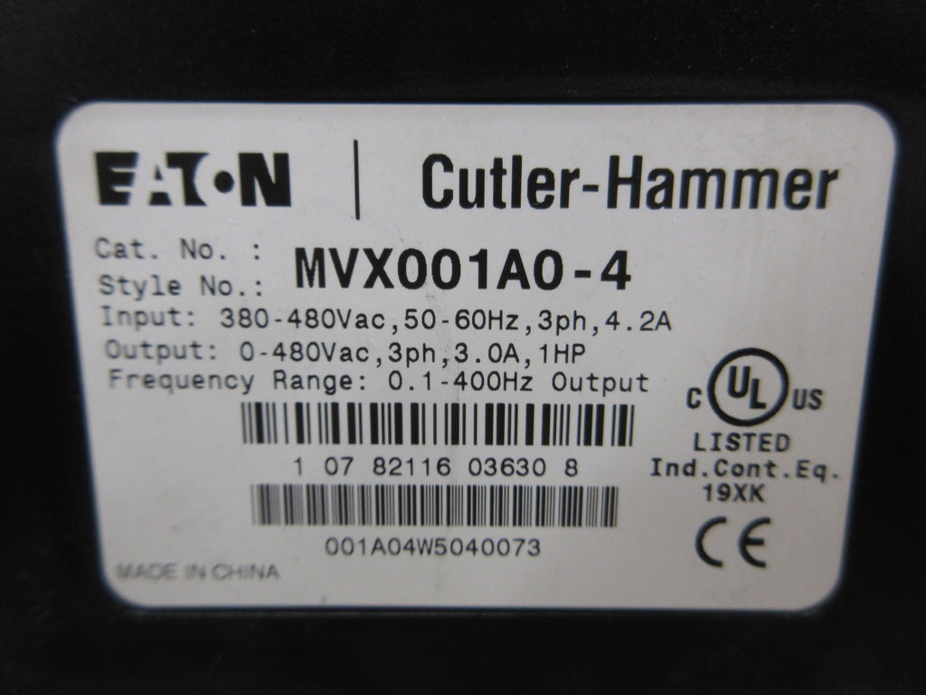 Eaton MVX9000 AC Drive Part #: MVX001A0-4 1 HP 3Ph Input: 380-480 VAC 50-60 Hz 4.2 A Output: 0-480 VAC 3.0 A 0.1-400 Hz w/ Keypad Used Loc: 57H2-6