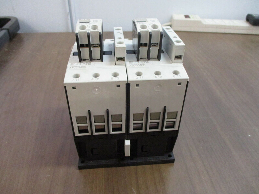 Eaton Reversing Contactor XTCE040D 120V Coil w/(2) Aux Contact Block Used Condition: UsedCoil Voltage: 120 VFeatures: ReversingMPN: XTCE040DBrand: Eaton Eaton Reversing Contactor XTCE040D 120V Coil w/(2) Aux Contact Block Used Eaton Reversing Contactor Part#: XTCE040D 120 V Coil w/(2) Aux Contact Block Used Loc: 15E2-57 Eaton Reversing Contactor Part#: XTCE040D 120 V Coil w/(2) Aux Contact Block Uséd Loc: 15E2-57