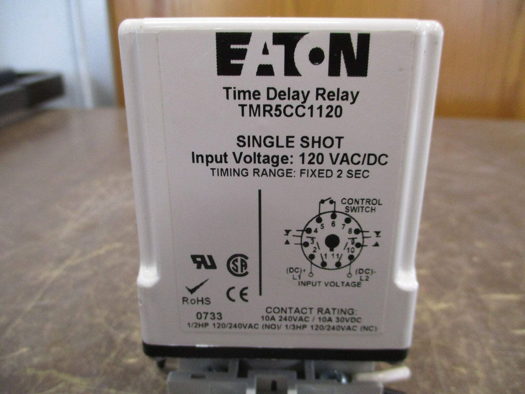 Eaton Time Delay Relay Part #: TMR5CC1120 120 V AC/DC Delay: Fixed 2 Sec. w/ Base *No DIN Rail Mount* Used Loc: 59E3-28