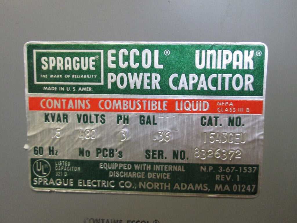 Eccol Unipak Power Capacitor 1543CEU 480V 15 KVAR 3Ph 60Hz Used