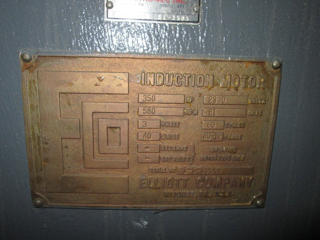 Elliot Company Motor 1-S-10668 350HP 600 RPM's 40-12 Frame 2300V 81A