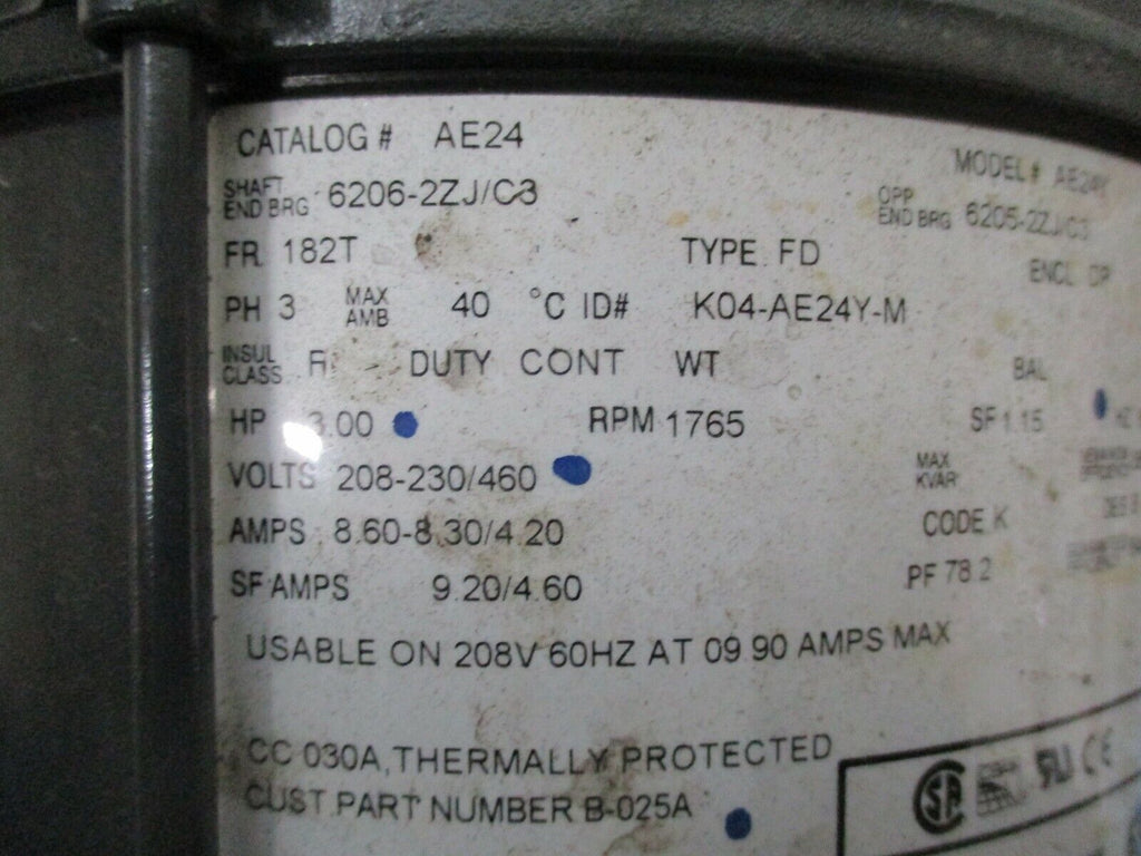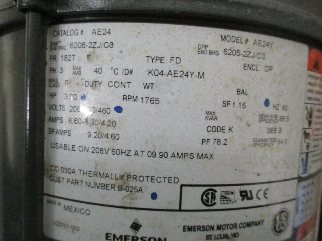 Emerson AC Motor AE24Y 3HP 1800RPM 208-230/460V 8.6-8.3/4.2A 60Hz DP Encl. Used