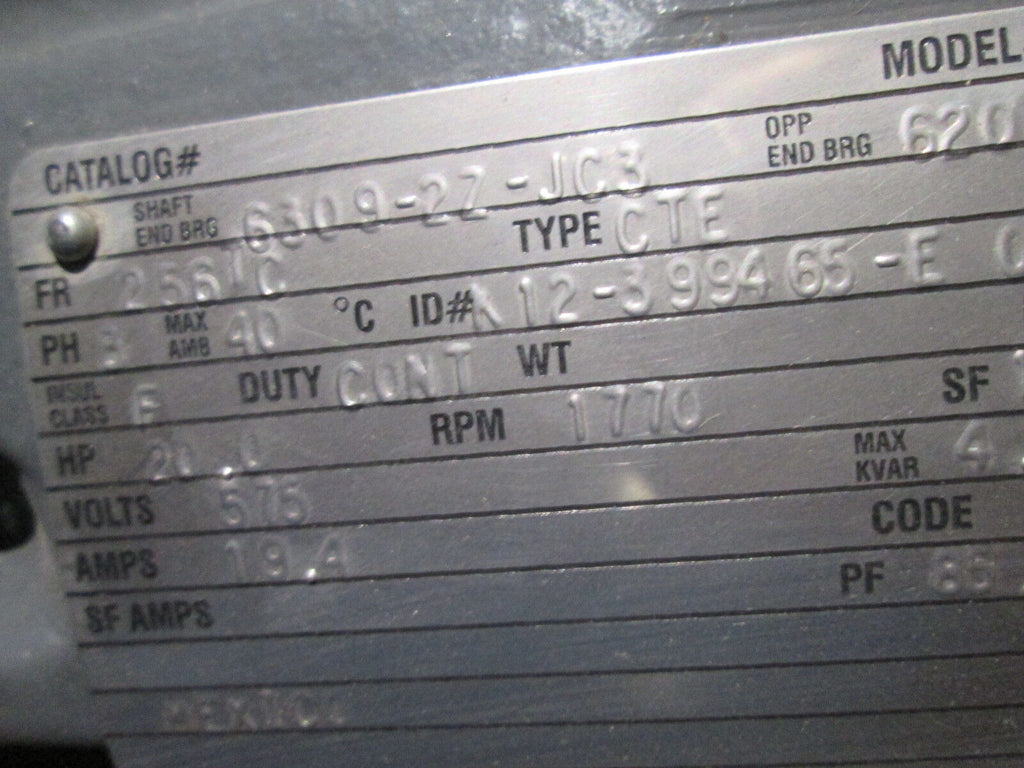 Emerson AC Motor H379 20HP 1770RPM FR: 256TC ENCL:TE 575V 19.4A Used_x000D_ Condition: UsedMPN: H379Brand: Emerson Emerson AC Motor H379 20HP 1770RPM FR: 256TC ENCL:TE 575V 19.4A Used Emerson AC Motor Part #: H379 20HP 1770RPM Frame: 256TC Enclosure: TE 575V 19.4A UsedLOC AB8F2-2 Emerson AC Motor Part #: H379 20HP 1770RPM Frame: 256TC Enclosure: TE 575V 19.4A Uséd LOC AB8F2-2