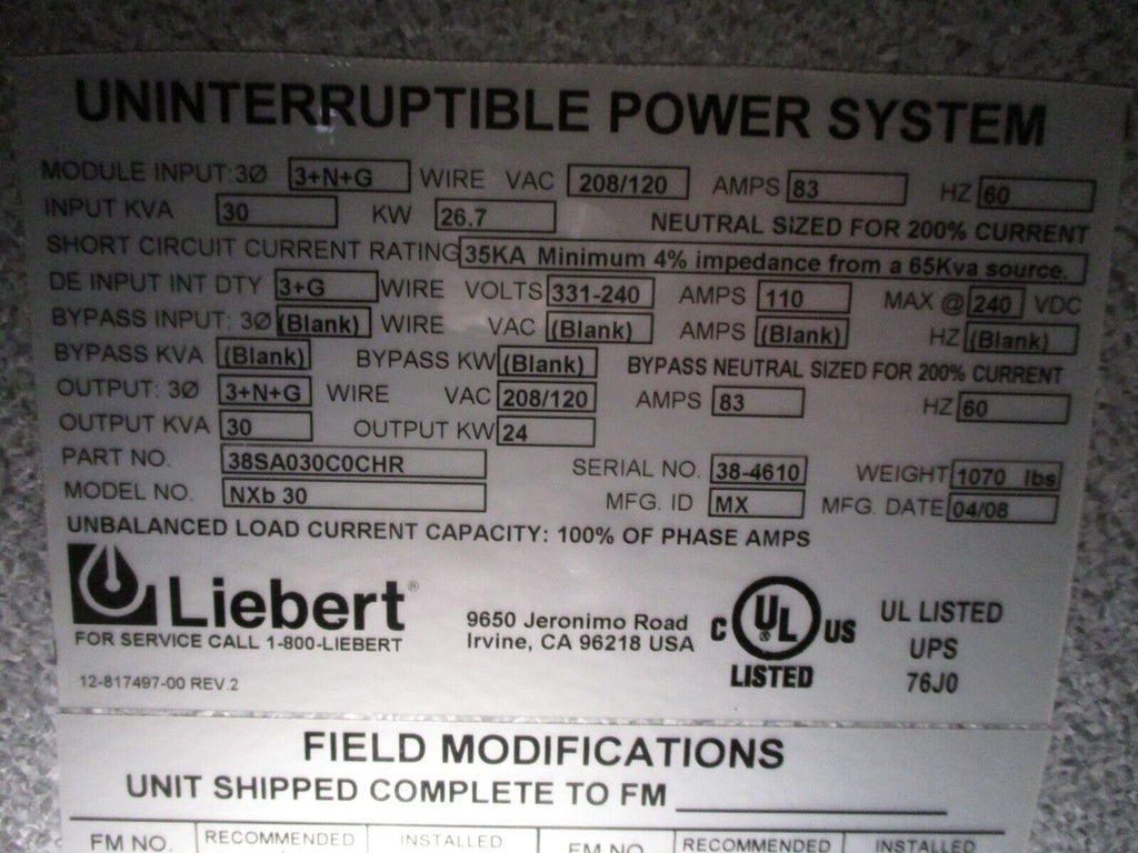 Emerson Liebert NXB 30 UPS 38SA030C0CHR 30KVA 24kW *Bent Key* Used
