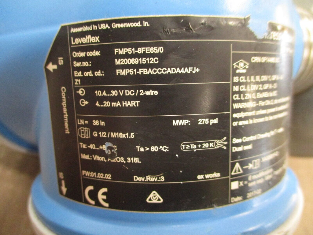 Endress+Hauser LevelFlex Guided Wave Rader Level Transmitter Part #: FMP51-8FE85/0 10.4-30 VDC4-20mA Hart36" UsedLoc: AB11-5946 / AB7I1- Part #: FMP51-8FE85/0