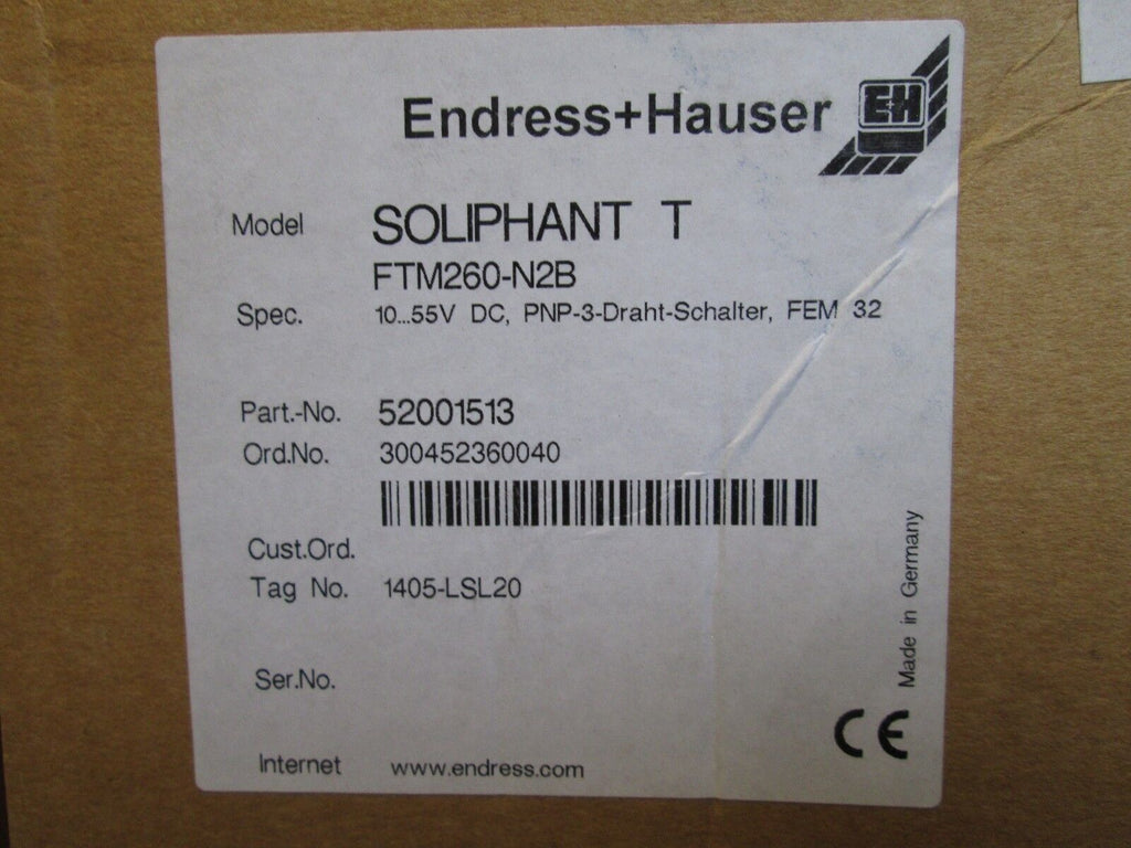 Endress+Hauser Soliphant T Vibration Level Switch FTM260-N2B 10...55VDC Condition: New – Open boxMPN: FTM260-N2BBrand: Endress+Hauser Endress+Hauser Soliphant T Vibration Level Switch FTM260-N2B 10...55VDC Endress+Hauser Soliphant T Vibration Level Switch Part #: FTM260-N2B 10...55VDCPNP-3-Wire-SwitchFEM 32New SurplusLOC AB2H2-7 Endress+Hauser Soliphant T Vibration Level Switch Part #: FTM260-N2B 10...55VDC PNP-3-Wire-Switch FEM 32 New Surplus LOC AB2H2-7