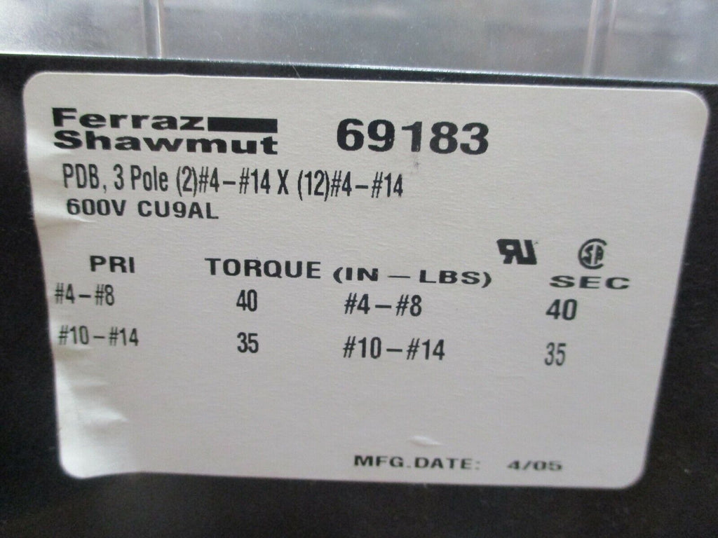 Ferraz Shawmut Power Distribution Block 69183 600V 3P Used Condition: UsedMPN: 69183Brand: Ferraz Shawmut Ferraz Shawmut Power Distribution Block 69183 600V 3P Used Ferraz Shawmut Power Distribution Block Part #: 69183 Line: #4 - #8, #10 - #14Load: #4 - #8, #10 - #14600V 3P UsedLOC 18J2-13 Ferraz Shawmut Power Distribution Block Part #: 69183 Line: #4 - #8, #10 - #14 Load: #4 - #8, #10 - #14 600V 3P Uséd LOC 18J2-13