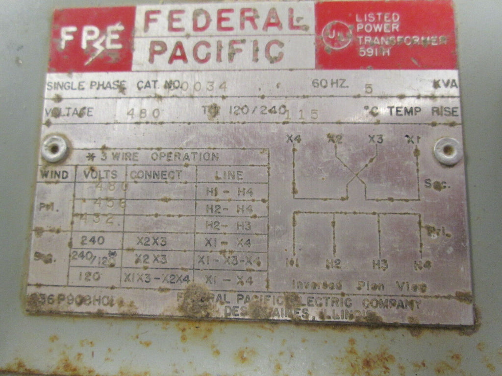 FPE 1Ph Power Transformer 30034 5KVA Pri: 480V Sec: 120/240V 6...