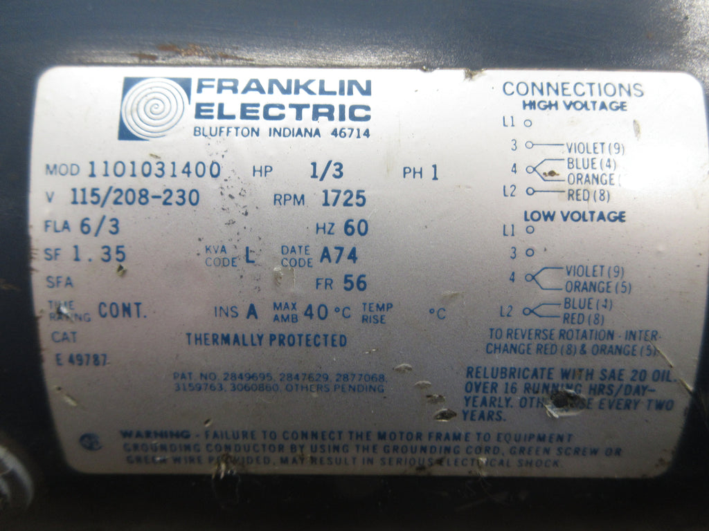 Franklin Electric Motor Part #: 1101031400 1/3 HP 1725 RPM 115/208-230 V 6/3 A 1Ph 60 Hz Frame: 56 Used Loc: AB11-8331 / AB5K2