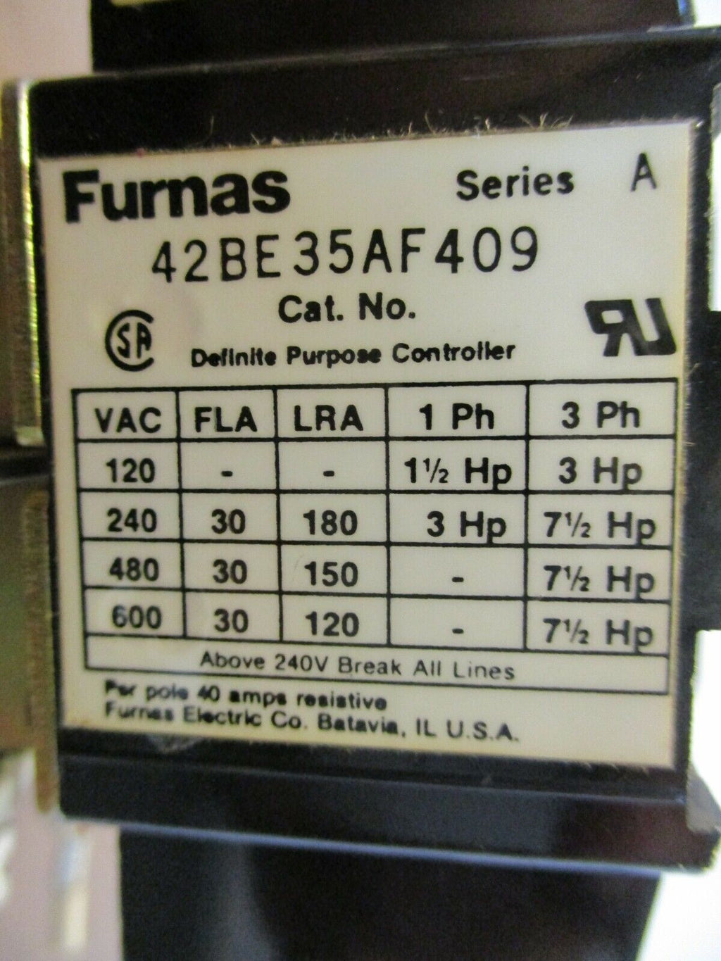 Furnas Contactor 42BE35AF409 120V Coil 30A 600V Used Condition: UsedModified Item: NoCustom Bundle: NoNumber of Poles: 3-PoleFull Load Amperage Rating: 30 AMPN: 42BE35AF409Coil Volts: 120 VACBrand: Furnas Furnas Contactor 42BE35AF409 120V Coil 30A 600V Used Furnas Contactor Part #: 42BE35AF409 120V Coil 30A 600V UsedLOC 12C2-8 Furnas Contactor Part #: 42BE35AF409 120V Coil 30A 600V Uséd LOC 12C2-8