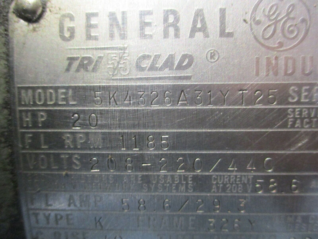 GE AC Motor 5K4326A31YT25 20HP 1200RPM FR: 326Y 208-220/440V 58.6/28.3A Used Condition: UsedMPN: 5K4326A31YT25Brand: GE GE AC Motor 5K4326A31YT25 20HP 1200RPM FR: 326Y 208-220/440V 58.6/28.3A Used GE AC Motor Part #: 5K4326A31YT25 20HP 1185RPM Frame: 326Y 208-220/440V 58.6/28.3A UsedLOC AB11-1442 / AB11-1445 / AB5P2/AB5Q3 GE AC Motor Part #: 5K4326A31YT25 20HP 1185RPM Frame: 326Y 208-220/440V 58.6/28.3A Uséd LOC AB11-1442 / AB11-1445 / AB5P2/AB5Q3