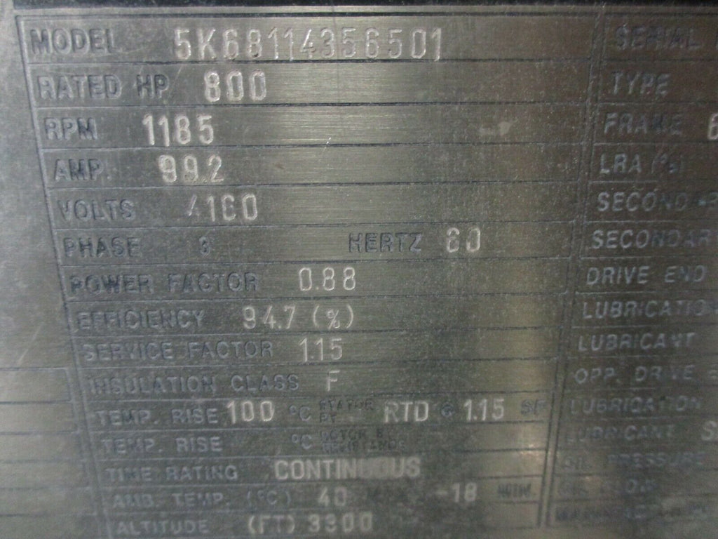 GE AC Motor 5K68114356501 800HP 1200RPM FR:6811SU ENCL:TEFC 4160V 99.2A Used