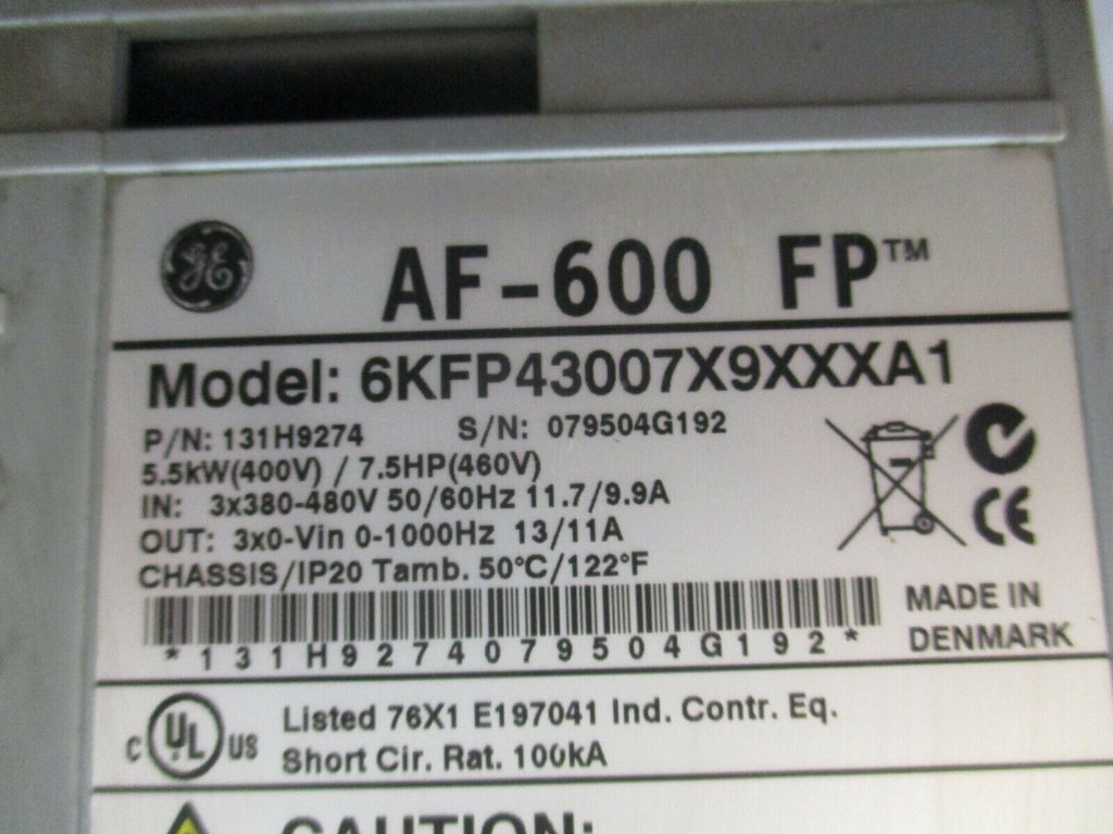 GE AF-600 FP AC Drive Part #: 131H9274 Model: 6KFP43007X9XXXA1 7.5 HP 3Ph Input: 3x380-480 V 50/60 Hz 11.7 / 9.9 A Output: 3x0-Vin 0-1000 Hz 13 / 11 A w/ Keypad *No Terminal Cover Screws* Used Loc: 18A1-3