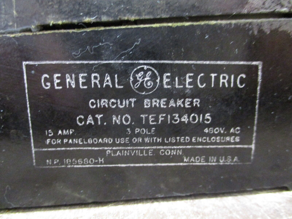 GE Circuit Breaker TEF134015 15A 480V 3P Used GE Circuit Breaker Part #: TEF134015 15 A 480 V 3P Used Loc: 12C3-35 GE Circuit Breaker Part #: TEF134015 15 A 480 V 3P Uséd Loc: 12C3-35