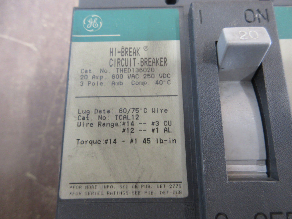 GE Circuit Breaker THED136020 20A 600V 3P New Surplus
