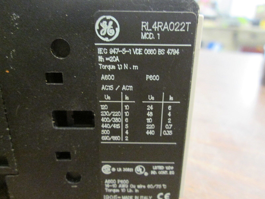 GE Contactor RL4RA022T 120V Coil 20A w/ Surge Suppressor Block Used Condition: UsedMPN: RL4RA022TBrand: GE GE Contactor RL4RA022T 120V Coil 20A w/ Surge Suppressor Block Used GE Contactor Part #: RL4RA022T 120V Coil 20A w/ Surge Suppressor Block UsedLOC 12G3-33 GE Contactor Part #: RL4RA022T 120V Coil 20A w/ Surge Suppressor Block Uséd LOC 12G3-33