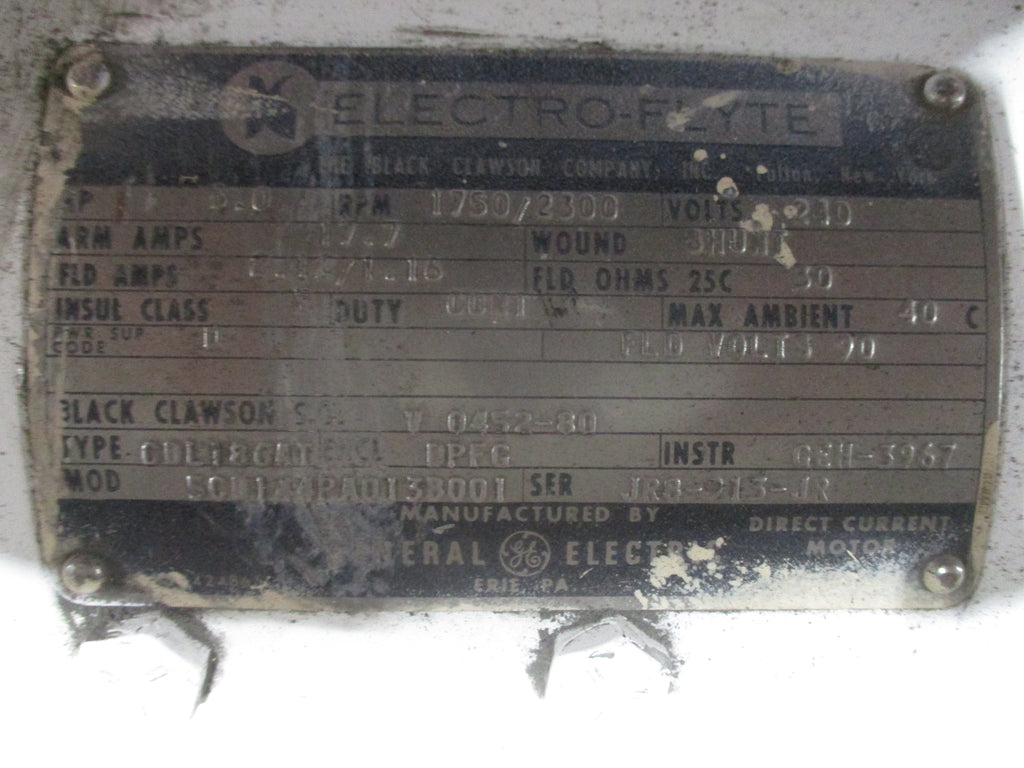 GE DC MOTOR 5CD144PA0138001 5.0HP 1750/2300RPM 240V Enclosure: DPFG 17.7A Shunt Wound Field Volts 90V Used_x000D_ GE DC MOTOR 5CD144PA0138001 5.0HP 1750/2300RPM 240V Enclosure: DPFG 17.7A Shunt Wound Field Volts 90V Used Weighs: 185 LBS AB11-7759 / AB6E1