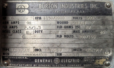 GE DC Motor Blower Ventilated 5CD194NA064A006 60HP 98A 1150/2000RPM 500V Used_x000D_ Condition: UsedBase RPM: 1150/2000Brand: GECurrent Type: DCEnclosure Type: DPFG-BVFull Load Amps: 98 AInsulation Class: F (Max 311°F)MPN: 5CD194NA064A006Rated Load (HP): 60 HP GE DC Motor Blower Ventilated 5CD194NA064A006 60HP 98A 1150/2000RPM 500V Used GE DC Motor Blower Ventilated Part #: 5CD194NA064A006 60 HP 98 A 1150 / 2000 RPM 500 V w/ Tachometer GeneratorDims: 52" x 26" x 26"Weighs: 1100 LBSUsed Loc: AB11-7051 / AB37C1 GE DC Motor Blower Ventilated Part #: 5CD194NA064A006 60 HP 98 A 1150 / 2000 RPM 500 V w/ Tachometer Generator Dims: 52" x 26" x 26" Weighs: 1100 LBS Uséd Loc: AB11-7051 / AB37C1