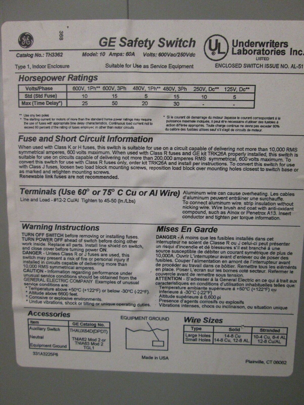 GE Fusible Safety Switch/Disconnect TH3362 60A 600V Type 1 Enclosure Used