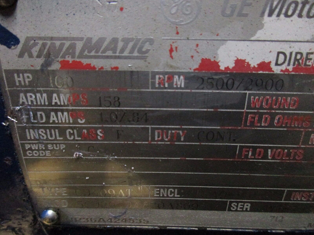 GE Kinamatic DC Motor w/ Blower Part #: CD409AT 100HP 2500/2900RPM 500V TEAO-WP Enclosure Arm : 158A Field : 1.0/.84A 300V Refurbished LOC AB4H4-1 1790 lbs.