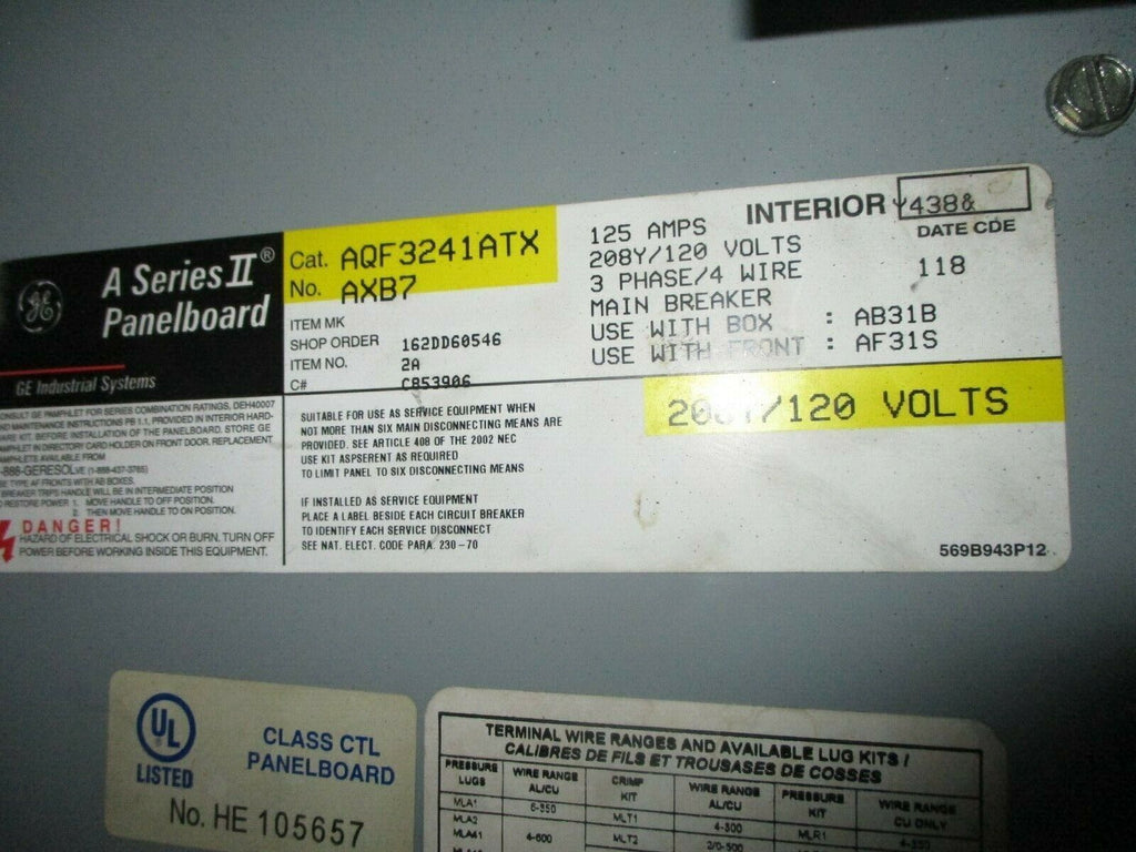 GE Main Breaker Circuit Breaker Panel AQF3241ATX 100A Main 125A Max 208Y/120V