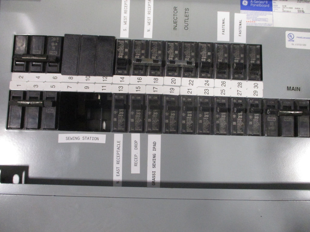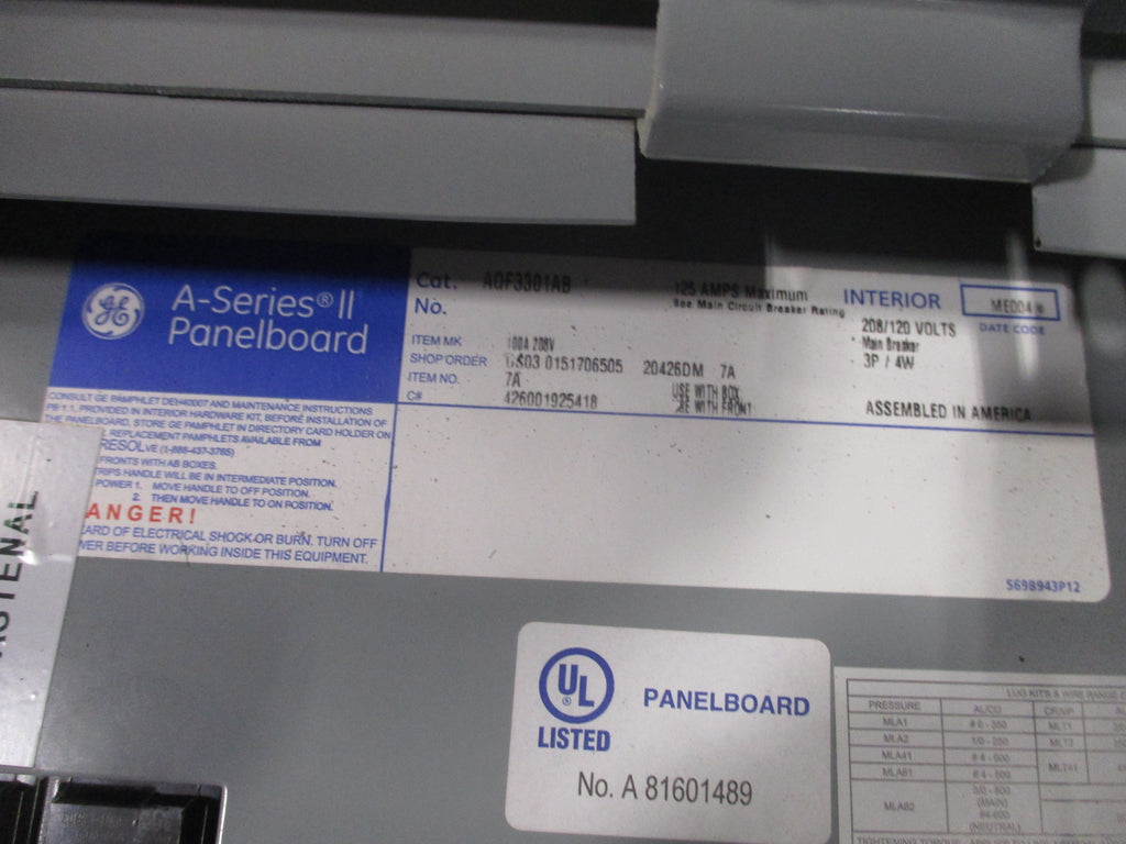 GE Main Breaker Circuit Breaker Panel AQF3301AB 100A Main 125A Max 208/120V 3PH 4W 30-Circuit Breakers: (2) 30A 3P (1) 100A 3P (2) 20A 2P (14) 20A 1P Used LOC AB11-8651