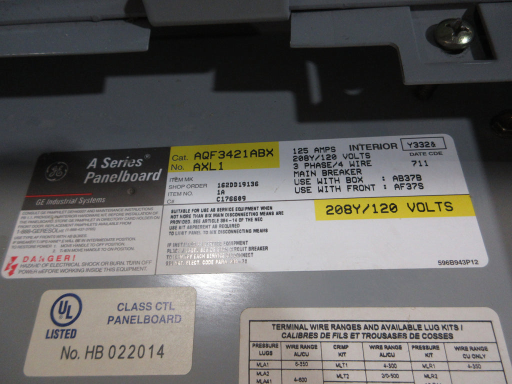 GE Main Breaker Circuit Breaker Panel AQF3421ABX AXL1 100A Main 125A Max 3Ph 4W