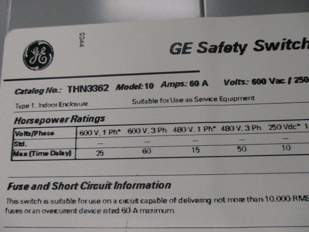 GE Non-fused Safety Switch THN3362 60A 600V 3P 3W Used Conditi...