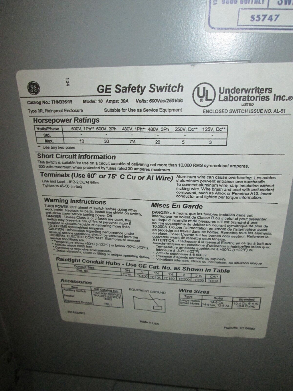 GE Non-Fusible 3R Safety Switch TFN3361R 30A 600V Used Conditi...