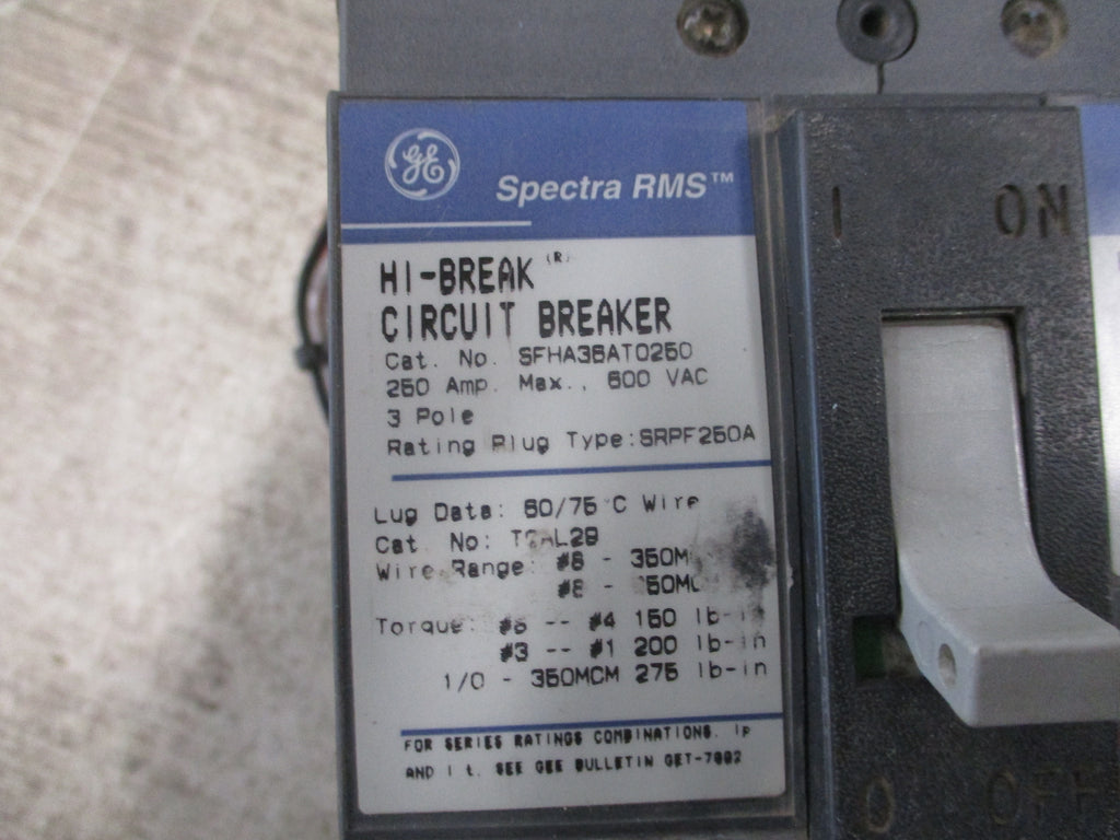 GE Spectra RMS Hi-Break Circuit Breaker SFHA3BAT0250 250A 600V 3P Used LOC 56H4-13