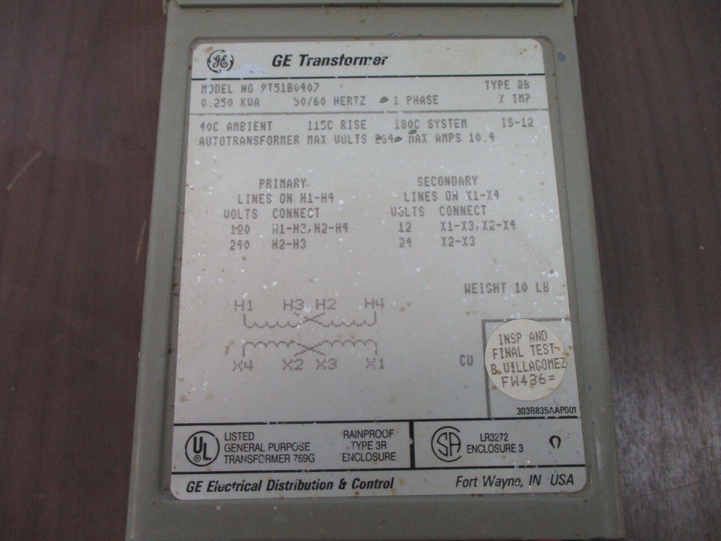 GE Transformer 9T51B0407 0.250kVA Pri: 120/240V Sec: 12/24V 1Ph 50/60 Hz Used