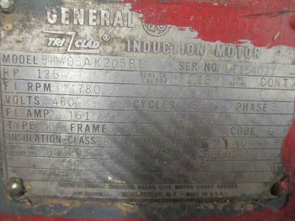 GE Tri Clad Induction Motor Type K 5K405AK205B1 460V 151A 125HP 3PH 1800RPM Used