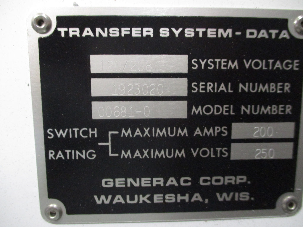 Generac Olympian Automatic Transfer Switch 00681-0 200A 120/208V Used