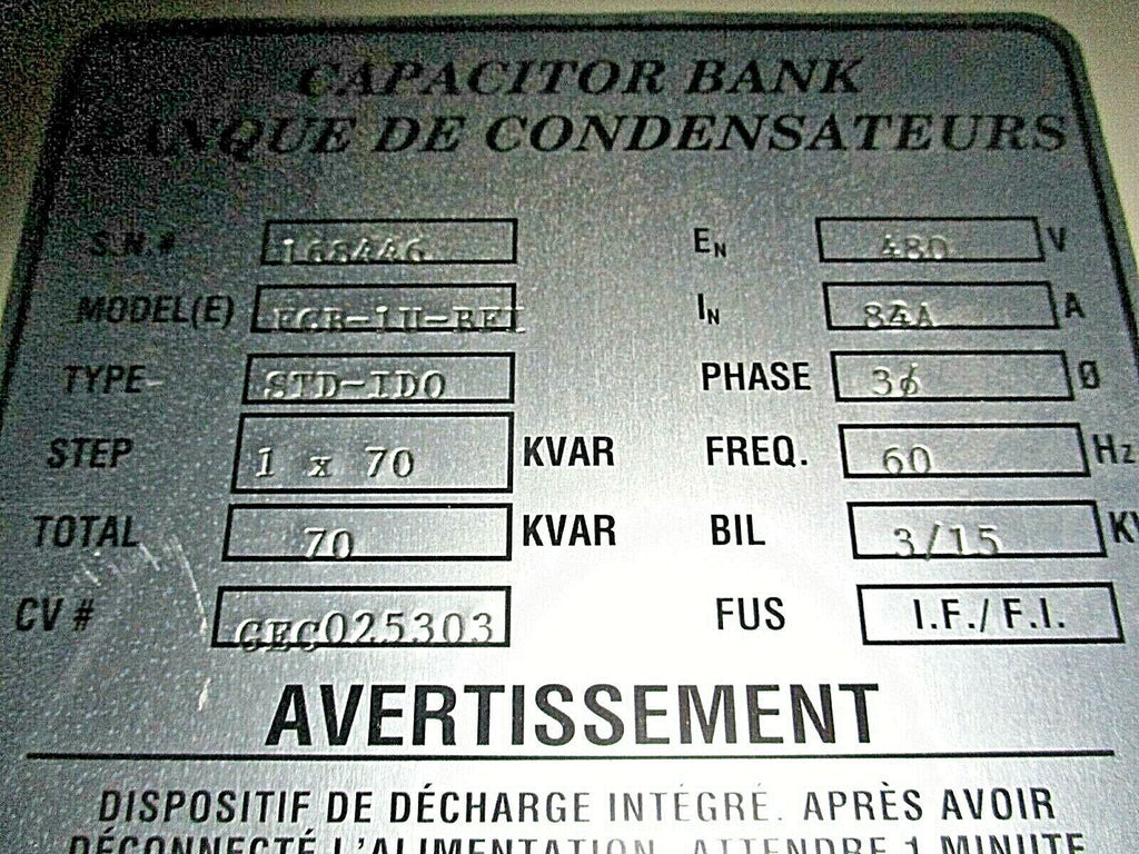 Gentec Capacitor Bank FCB-1U-BFI Type STD-ID0 70kVAR 480V 3Ph ...