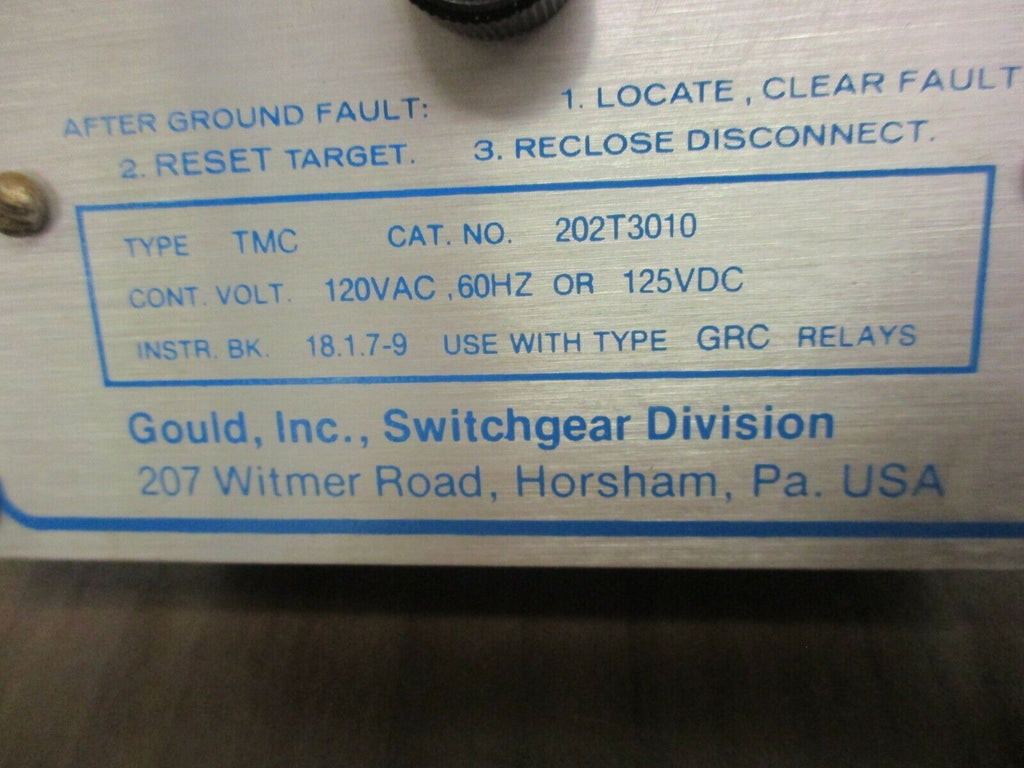 Gould Ground Shield Ground Fault Monitor 202T3010 120VAC 60Hz 125VDC Used Condition: UsedVoltage Rating (AC): 120 VACVoltage Rating (DC): 125 VDCMPN: 202T3010Brand: Gould Gould Ground Shield Ground Fault Monitor 202T3010 120VAC 60Hz 125VDC Used Gould Ground Shield Ground Fault Monitor Part #: 202T3010 120VAC 60Hz 125VDC Type TMCUse w/ Type GRC RelaysUsedLOC 25B2-17 Gould Ground Shield Ground Fault Monitor Part #: 202T3010 120VAC 60Hz 125VDC Type TMC Use w/ Type GRC Relays Uséd LOC 25B2-17