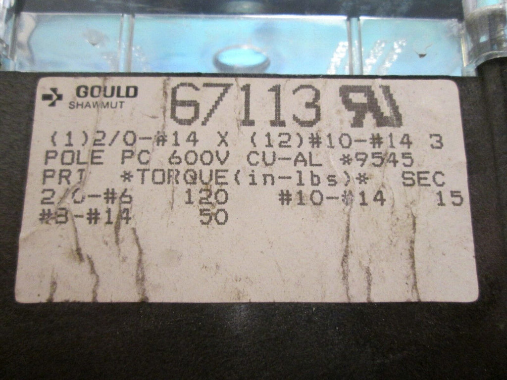 Gould Power Distribution Block 67113, Line (1) 2/0- #14,Load(12)#10-#14, 3P Used
