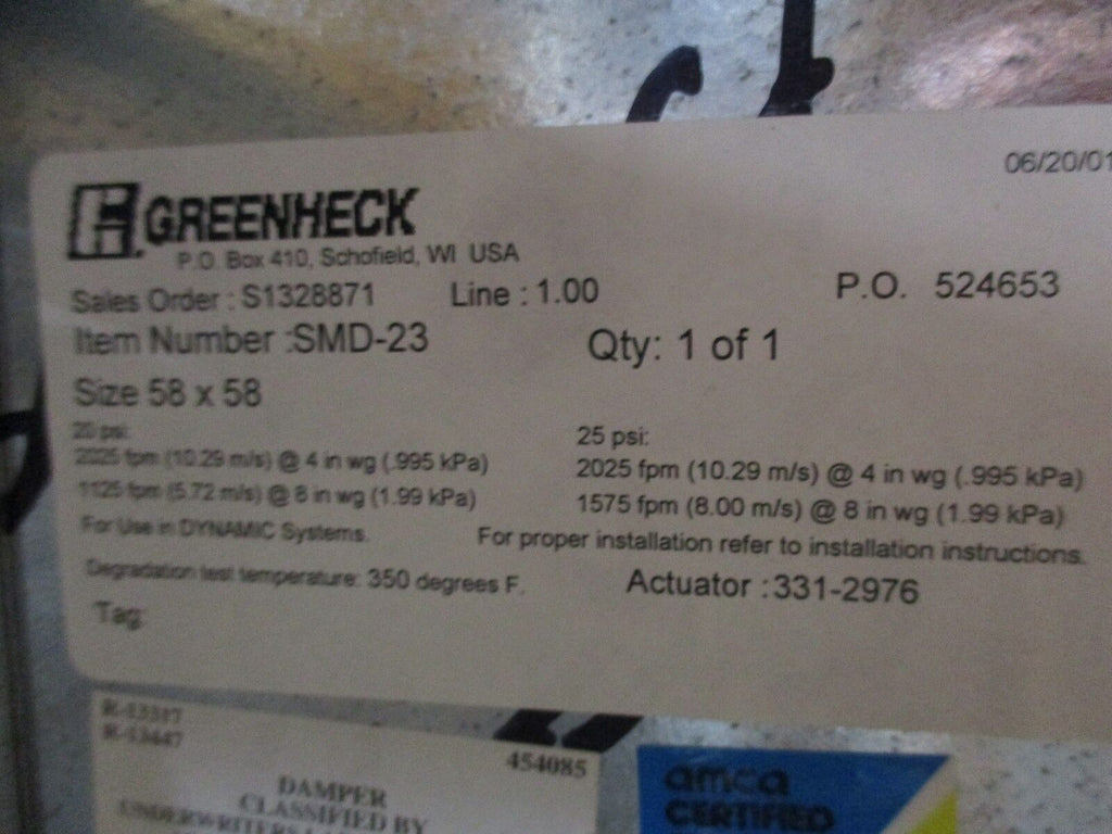 Greenheck Smoke Dampers Part #: SMD-23 58 x 58" New Surplu...