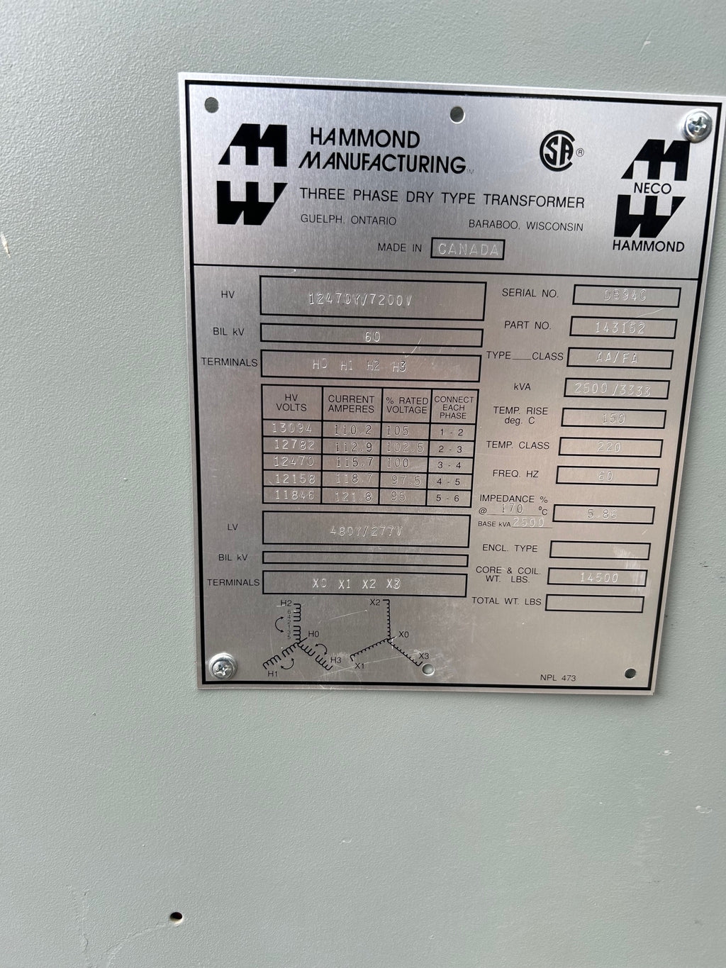 Hammond Transformer Part #: 143152 2500/3333 KVA High Volt: 12470Y / 7200V Low Volt: 480Y / 277V 60 Hz 3Ph Taps: 13,094 V 12,782 V 12,470 V 12,158 V 11,845 V Approximate Weight: 16,500 LBS Used Loc: AB11-7457